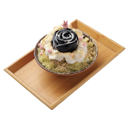 黑亮仙草幻化為盛開玫瑰,宛如夜色中的花朵,搭配綿密冰體與香濃擂茶醬汁及麵茶粉,口感清涼滑嫩,層次細膩夢幻,沁涼迷人。